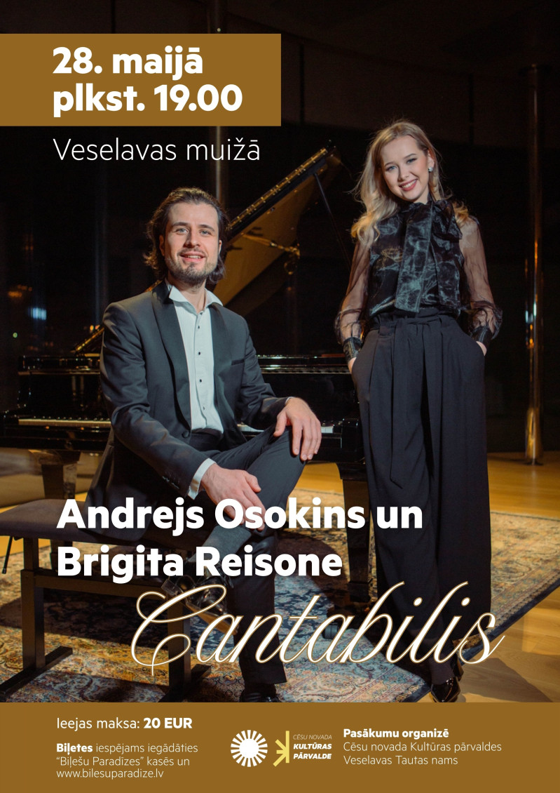 Ceturtdien, 28. maijā, plkst. 19.00 Veselavas muižā viesosies Andrejs Osokins un Brigita Reisona ar koncertprogrammu "Cantabilis".