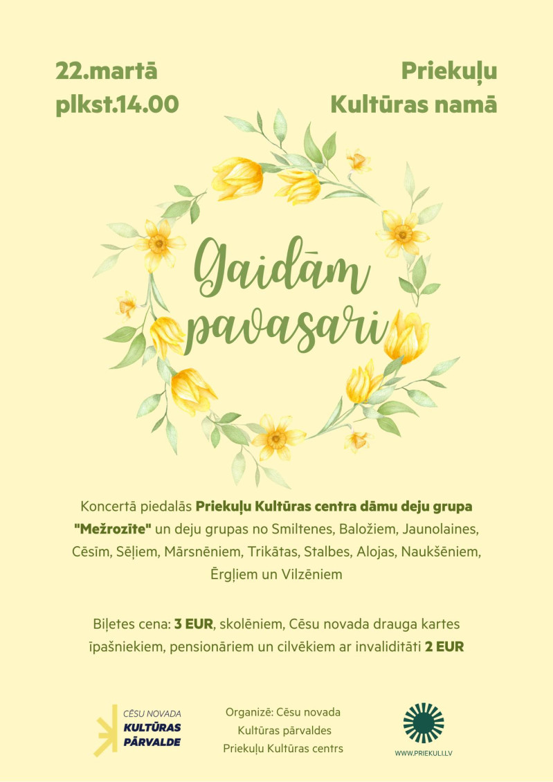 Svētdien, 22. martā, plkst. 14.00 Priekuļu Kultūras namā aicinām uz koncertu “Gaidām pavasari”, kurā ar krāšņiem un sirsnīgiem deju priekšnesumiem priecēs Priekuļu Kultūras nama dāmu deju grupa “Mežrozīte”, kā arī deju grupas no Smiltenes, Baložiem, Jaunolaines, Cēsīm, Sēļiem, Mārsnēniem, Trikātas, Stalbes, Alojas, Naukšēniem, Ērgļiem un Vilzēniem.