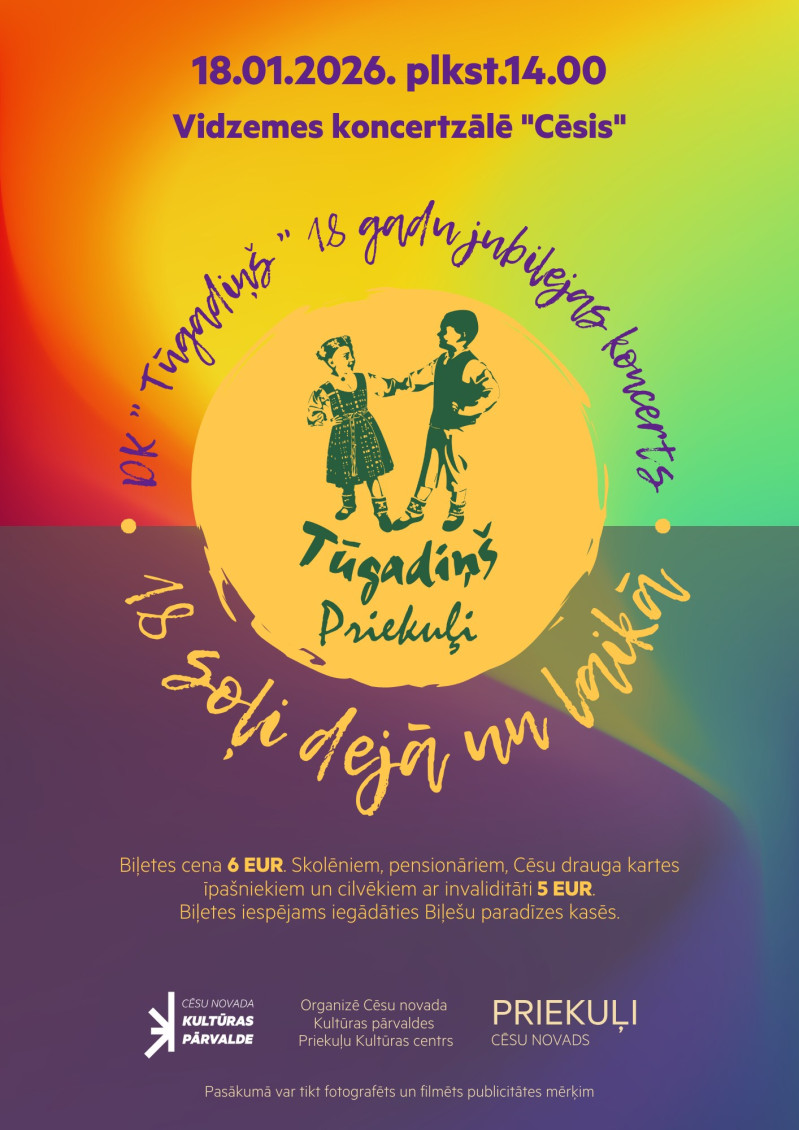 Svētdien, 18. janvārī, plkst. 14.00 koncertzālē "Cēsis" aicinām uz Priekuļu Kultūras centra deju kolektīva “Tūgadiņš” 18 gadu jubilejas koncertu - sirsnīgu un enerģisku ceļojumu dejā un laikā.