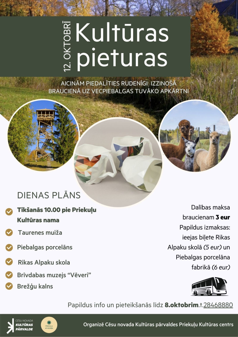 Aicinām pievienoties 12. oktobrī kultūras pieturās un kopīgi izbaudīt rudens skaistumu, jaunas atklāsmes un kopā būšanu. Brauciena sākums plkst. 10.00 pie Priekuļu Kultūras nama.