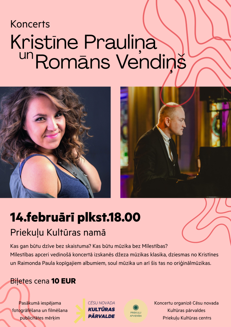Sestdien, 14. februārī, plkst. 18.00 Priekuļu Kultūras namā uz koncertu, kas iedvesmo pārdomām par mīlestību, aicina dziedātāja Kristīne Prauliņa un pianists Romāns Vendiņš.