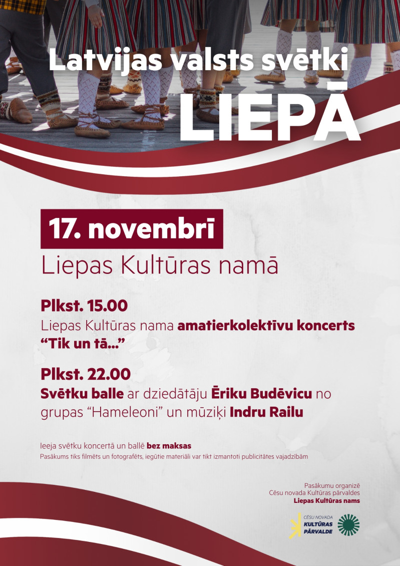 Dienu pirms Latvijas Republikas proklamēšanas 107. gadadienas, 17. novembrī, plkst. 15.00 Liepas Kultūras namā notiks amatierkolektīvu koncerts “Tik un tā…”. Koncertā priecēs BDK “Dālderīši”, folkloras kopa “Liepa”, amatierteātris “Krams” un Liepas pamatskolas audzēkņi.