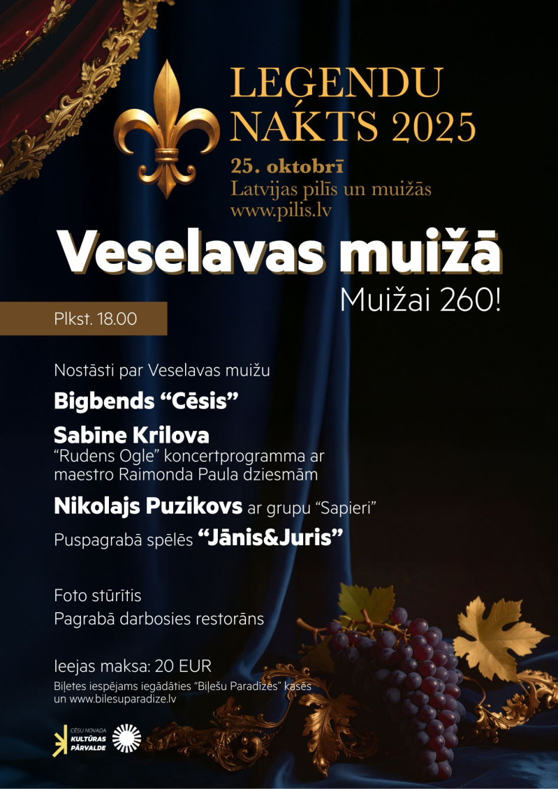 Sestdien, 25. oktobrī, no plkst. 18.00 Veselavas muižā norisināsies “Leģendu nakts 2025”.