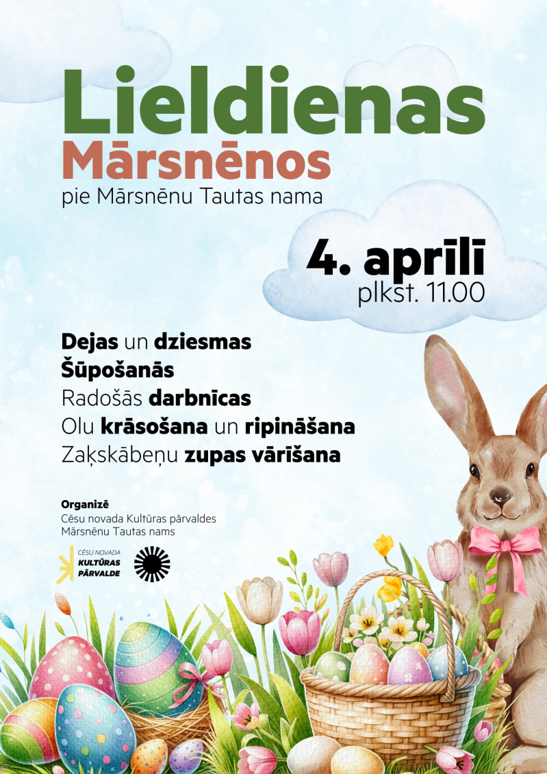 Aicinām ikvienu Lieldienu svinētāju 4. aprīlī plkst. 11.00 pie Mārsnēnu Tautas nama, lai kopā dejotu, dziedātu, šūpotos, piedalītos radošajās darbnīcās, krāsotu un ripinātu olas, kā arī nogaršotu īpašo zaķskābeņu zupu.