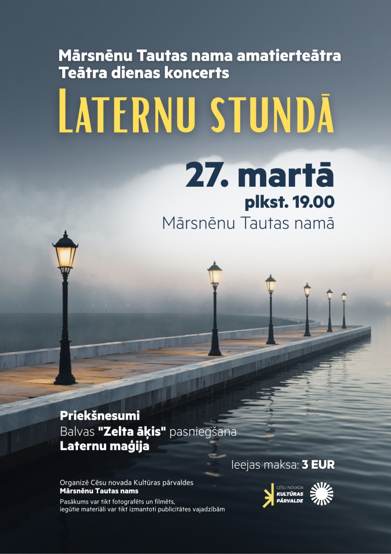 Mārsnēnu Tautas nama amatierteātris aicina uz Teātra dienas koncertu “Laternu stundā”, kas notiks 27. martā plkst. 19.00 Mārsnēnu Tautas namā.