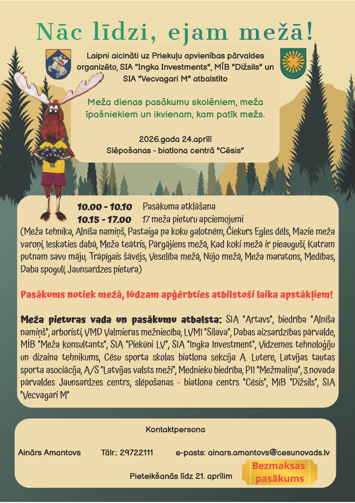 Cēsu novada Priekuļu apvienības pārvalde 2026. gada 24. aprīlī no plkst. 10.00 aicina skolēnus un ikvienu, kam patīk mežs, uz tradicionālo meža dienas pasākumu "Nāc līdzi, ejam mežā!", kas norisināsies slēpošanas un biatlona centra "Cēsis" teritorijā.