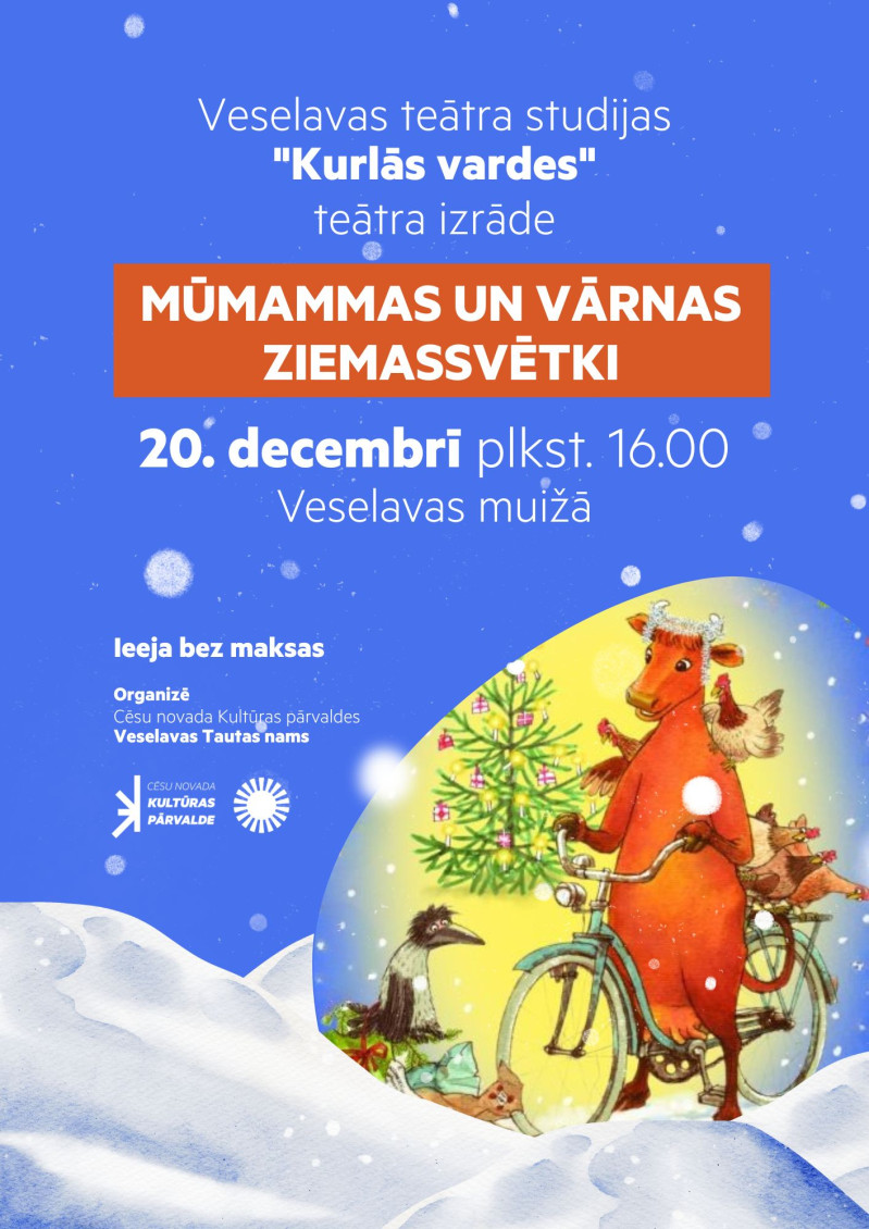Sestdien, 20. decembrī, plkst. 16.00 Veselavas muižā būs skatāma Veselavas teātra studijas “Kurlās vardes” izrāde “Mūmammas un vārnas Ziemassvētki” - brīnišķīgs stāsts ģimenēm, ko radījuši Juja Vīslandere un Svens Nūrdkvists.