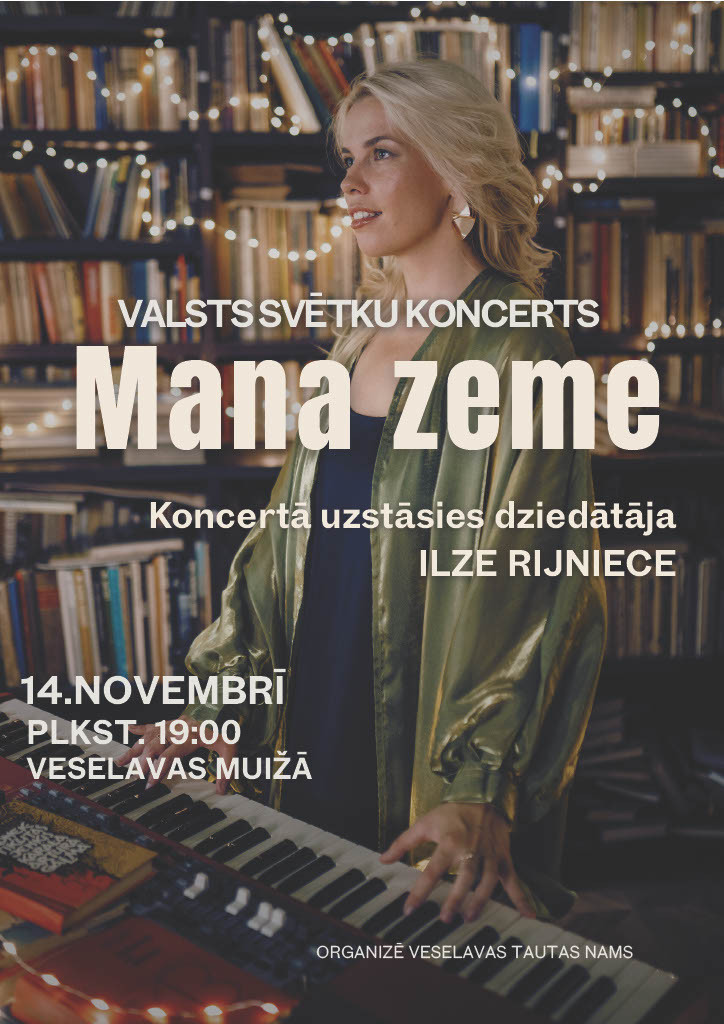 Piektdien, 14. novembrī, plkst. 19.00 Veselavas muižā notiks svētku koncerts “Mana zeme”, kurā ar sirsnīgām dziesmām un īpašu noskaņu priecēs dziedātāja Ilze Rijniece.