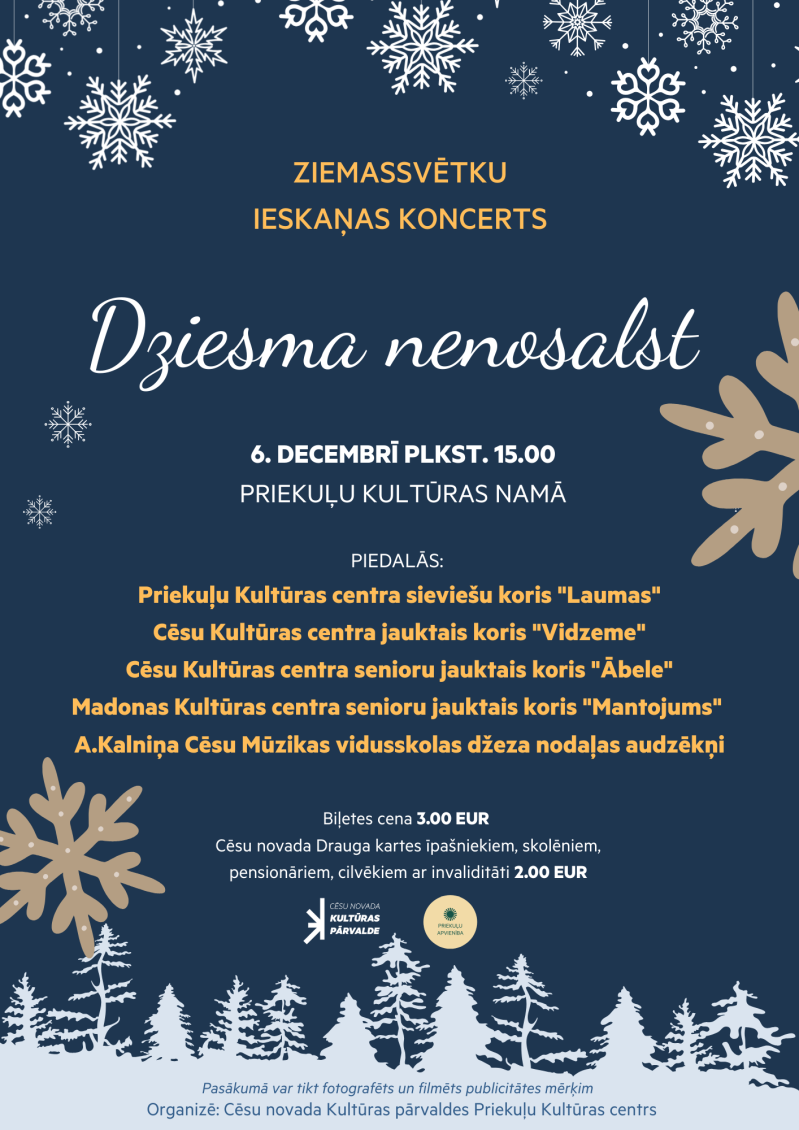 Aicinām uz Ziemassvētku ieskaņas koncertu “Dziesma nenosalst” 6. decembrī plkst. 15.00 Priekuļu Kultūras namā.