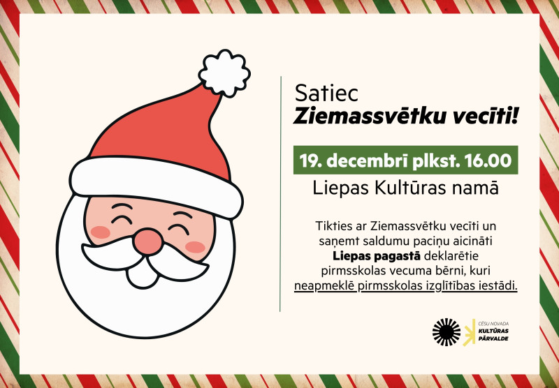 Piektdien, 19. decembrī, plkst. 16.00 Liepas Kultūras namā uz sirsnīgu tikšanos ar Ziemassvētku vecīti un saldumu paciņas saņemšanu aicināti Liepas pagastā deklarētie pirmsskolas vecuma bērni, kuri neapmeklē pirmsskolas izglītības iestādi.