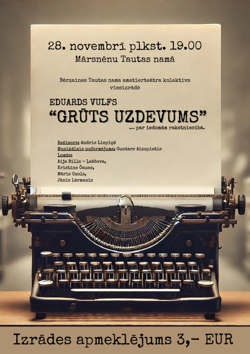 Piektdien, 28. novembrī, Mārsnēnu Tautas namā būs skatāma Bērzaines Tautas nama amatierteātra izrāde “Grūts uzdevums” pēc Edvarda Vulfa lugas motīviem, režisors Andris Liepiņš.