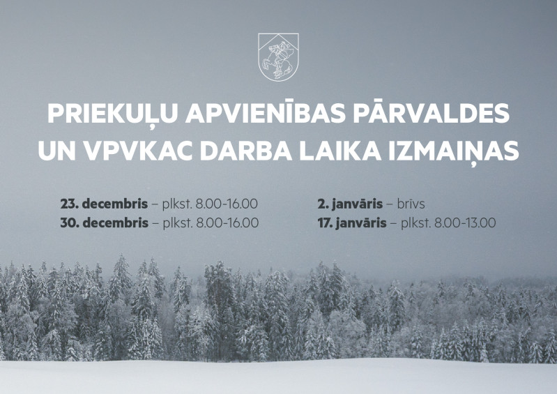 Informējam, ka svētku laikā mainīts Priekuļu apvienības pārvaldes un Valsts un pašvaldību vienoto klientu apkalpošanas centru (VPVKAC) darba laiks:
