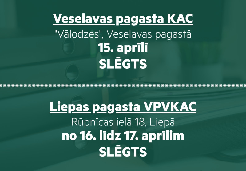 2026. gada 15. aprīlī būs slēgts Veselavas pagasta klientu apkalpošanas centrs (KAC) "Vālodzes", Veselavas pagastā un