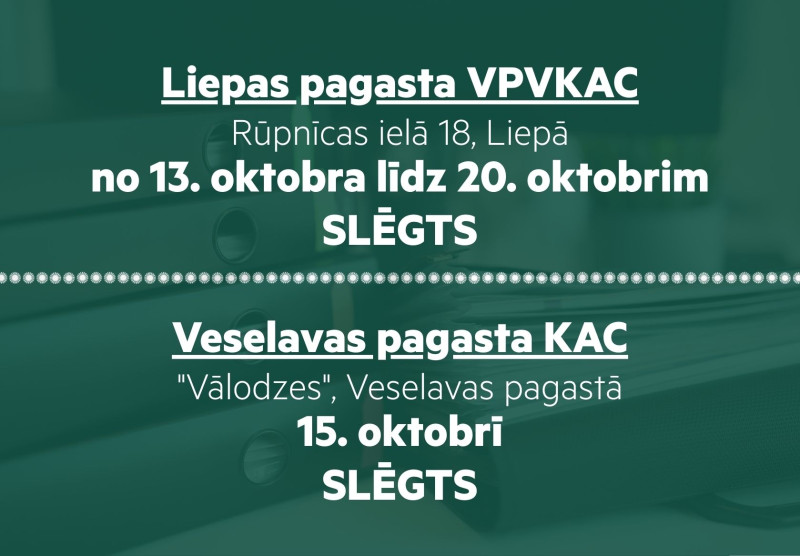 no 2025. gada 13. oktobra līdz 20. oktobrim (ieskaitot) būs slēgts Liepas pagasta valsts un pašvaldības vienotais klientu apkalpošanas centrs Rūpnīcas ielā 18, Liepā un