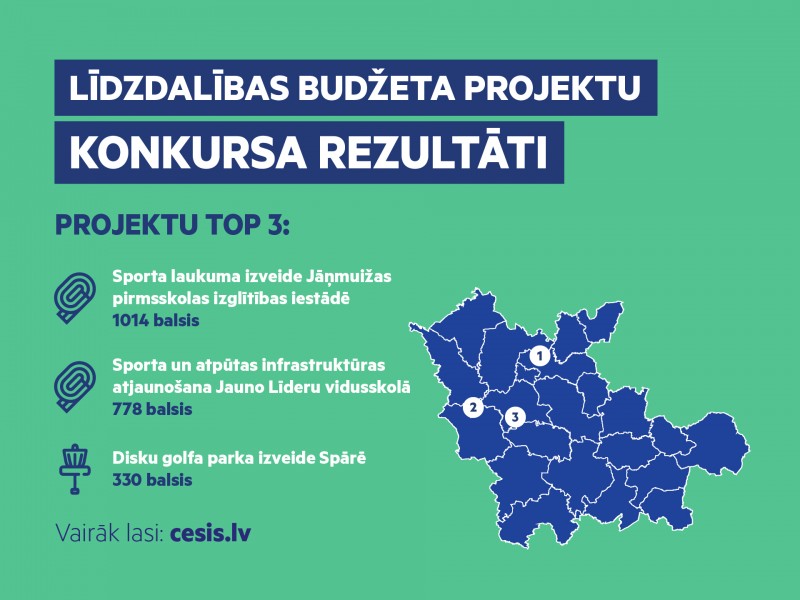Noslēdzies Cēsu novada iedzīvotāju balsojums 2024.gada līdzdalības budžeta projektu konkursā. Kopumā par 14 idejām saņemtas 3 640 balsis, lielāko atbalstu gūstot idejām par sporta laukuma izveidi Jāņmuižas pirmsskolas izglītības iestādē un sporta un atpūtas infrastruktūras atjaunošanu Līgatnes Jauno Līderu vidusskolas parkā.