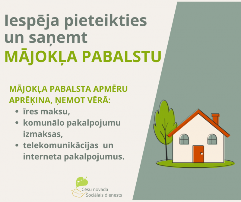 Mājokļu pabalstu mājsaimniecībām ar zemiem ienākumiem, kurās izdevumi par dzīvojamās telpas lietošanu ir lielāki par ienākumiem vai tie pilnībā nesedz izdevumus par dzīvojamās telpas lietošanu, piešķir Cēsu novada Sociālais dienests. Pabalsta mērķis ir palīdzēt novada sociāli mazaizsargātajām mājsaimniecībām.
