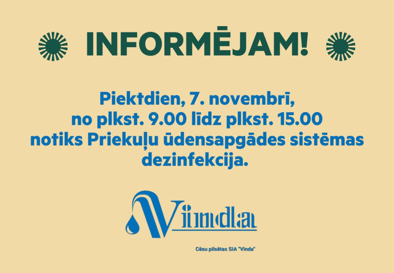Cēsu pilsētas SIA “Vinda” informē, ka piektdien, 7. novembrī, laika posmā no plkst. 9.00 līdz plkst. 15.00 notiks Priekuļu ūdensapgādes sistēmas dezinfekcija.