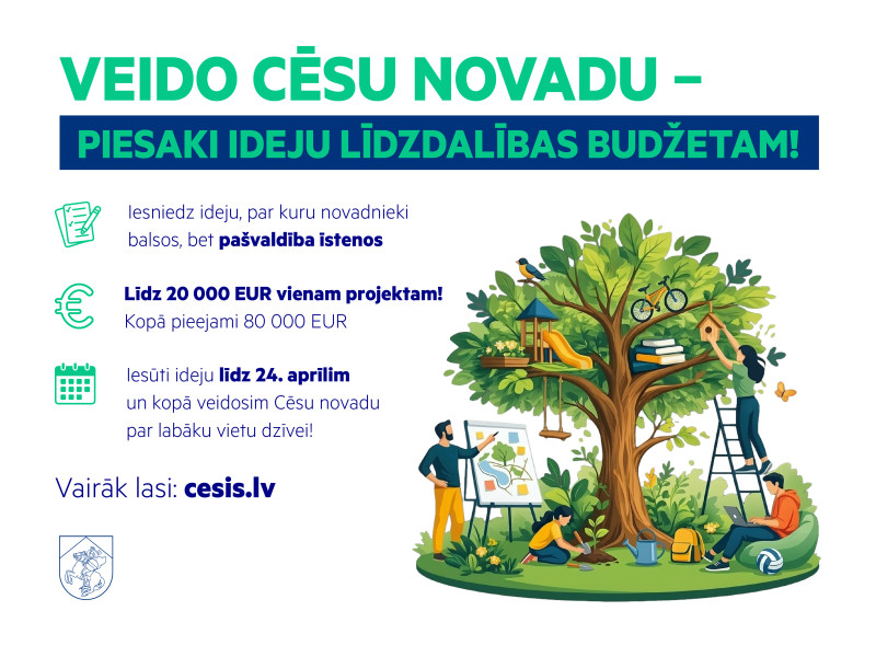 Turpinot sabiedrības iesaisti Cēsu novada attīstībā, izsludinām 2026. gada Cēsu novada līdzdalības budžeta projektu konkursu, aicinot iedzīvotājus iesniegt savas idejas novada attīstībai. Šogad konkursā kopējais pieejamais finansējums ir 80 000 EUR, savukārt viena projekta īstenošanai pieejamais finansējums palielināts līdz 20 000 EUR.